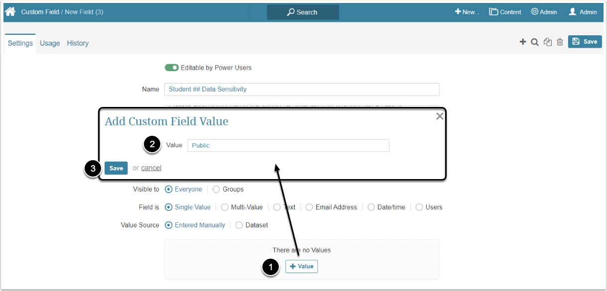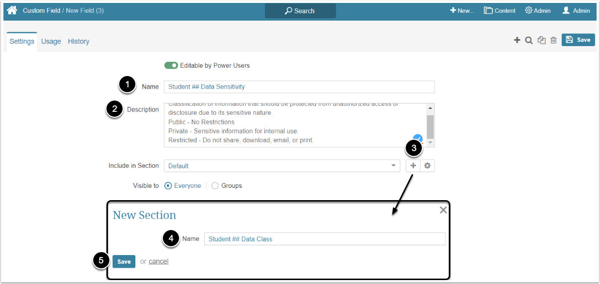 Name: Name the Field "<your name> Data Sensitivity". In this use case "Student ##" is used instead of a name