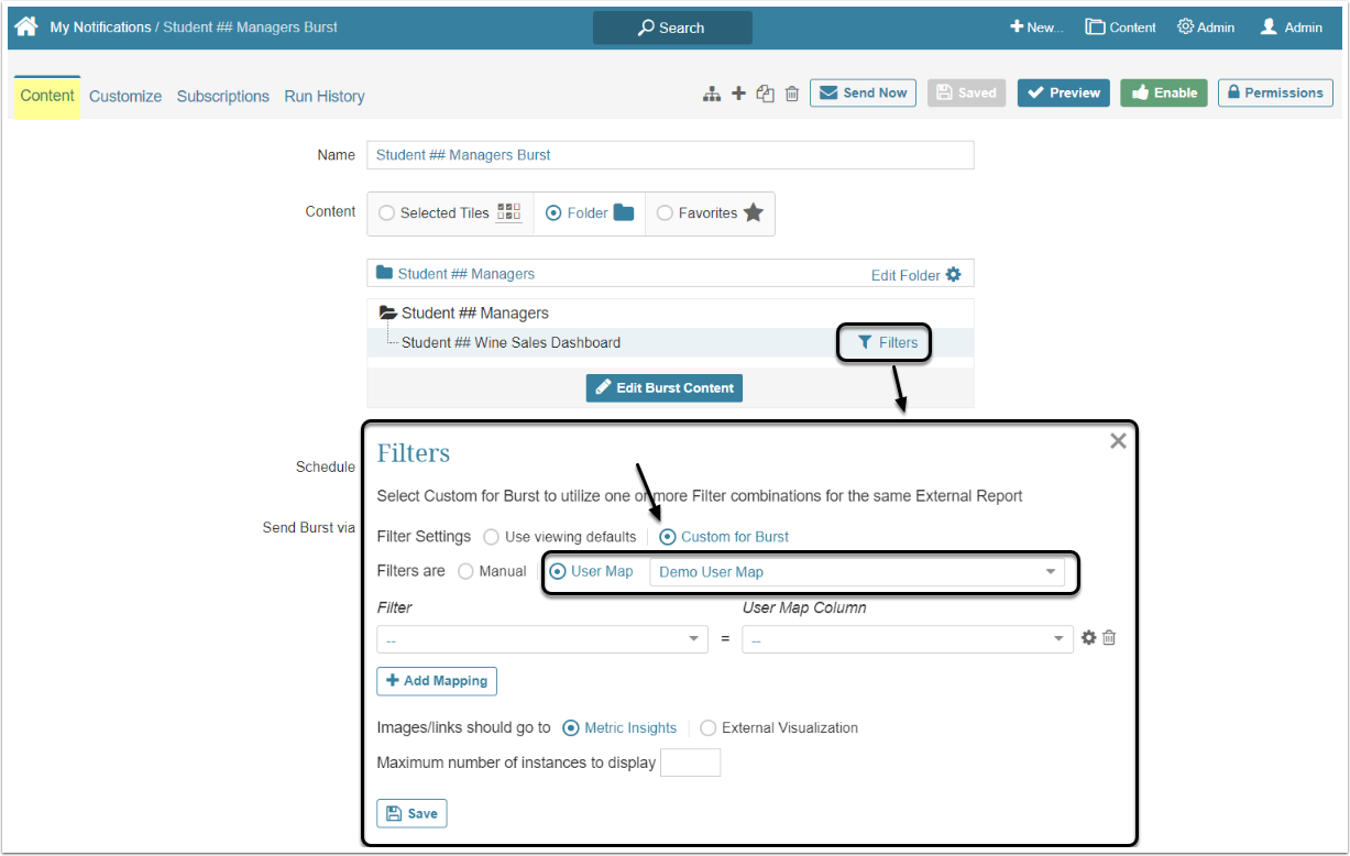 If some Filters were created for the Report or External Report, it is possible to apply User Map to that Report or External Report in the Burst Filters pop-up window. In this case User Map defines what a specific User sees in the Burst email.