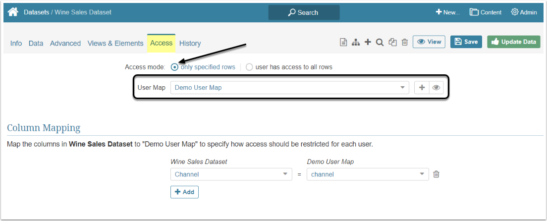 When applied to the Dataset, User Map defines the slices of data that specific User is allowed to see in the Dataset Viewer and the Report Viewer for any Reports created from that Dataset. For more details check the Apply a User Map to a Dataset article.