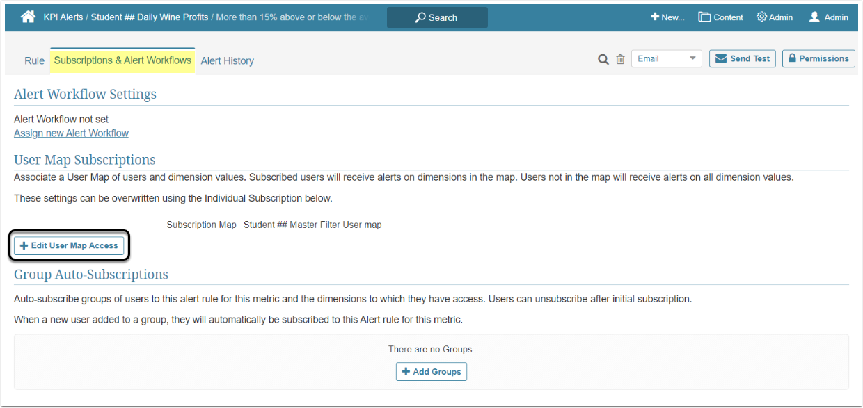 The User Map applied to the Alert Rule defines the Users who are subscribed to that Alert. For additional details check the [KPI Alert Rules] Wizard, types, criteria, user subscriptions article.