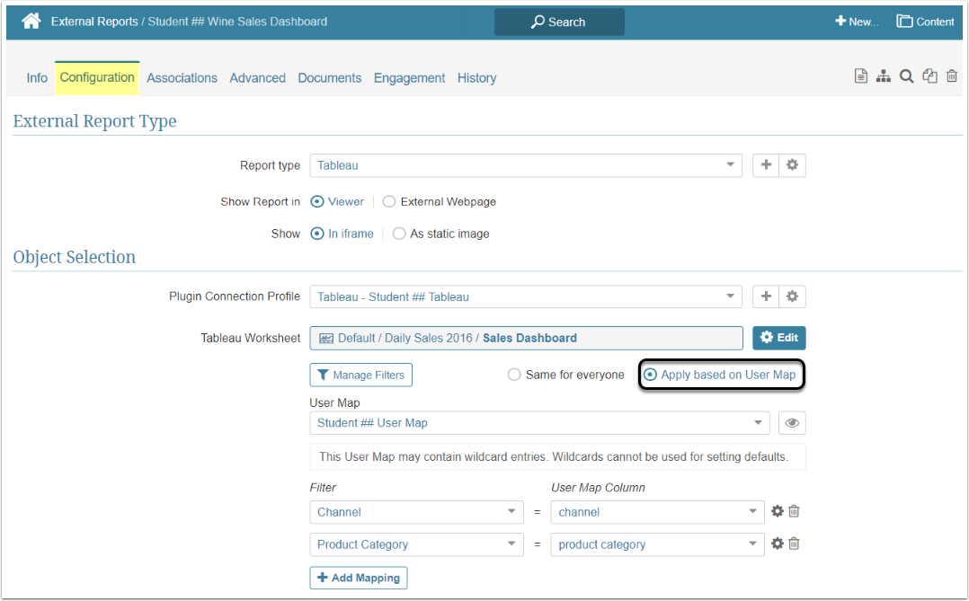 - External Report: The Users have access to all the values but the User map restricts what they see by default. The User can manually deselect the Filter Value selected by default and choose to apply other Filters instead