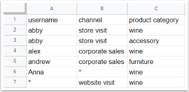 If the Wildcard Character is placed into "username" column, it means that all Users have access to the matched Filters. In this case, all Users will see sales made via the "website visit" for "wine" product category.