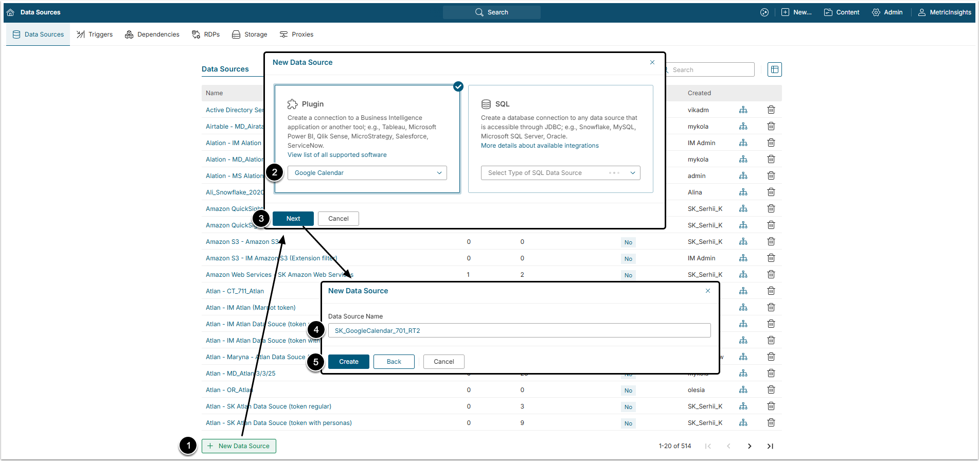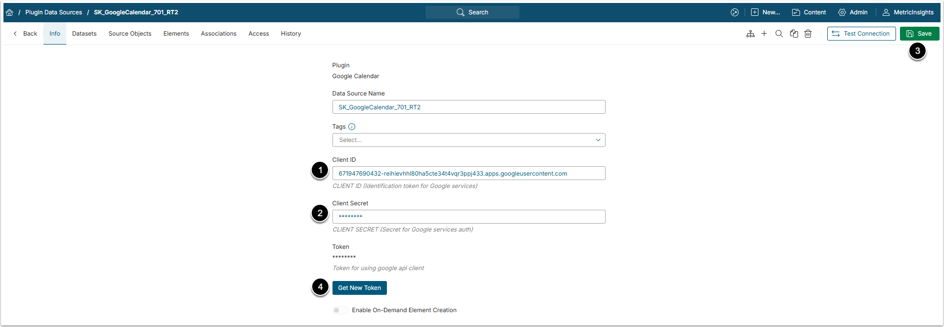 - Creating Google Plugin Data Sources in Metric Insights requires the usage of Client Credentials. For details, check Obtaining Client Application Credentials from Google Projects.