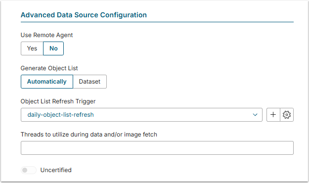 Advanced Configuration settings can be set to default values unless Data Source requires more precise tuning. For more details on how to proceed, refer to Advanced Data Source Configuration.