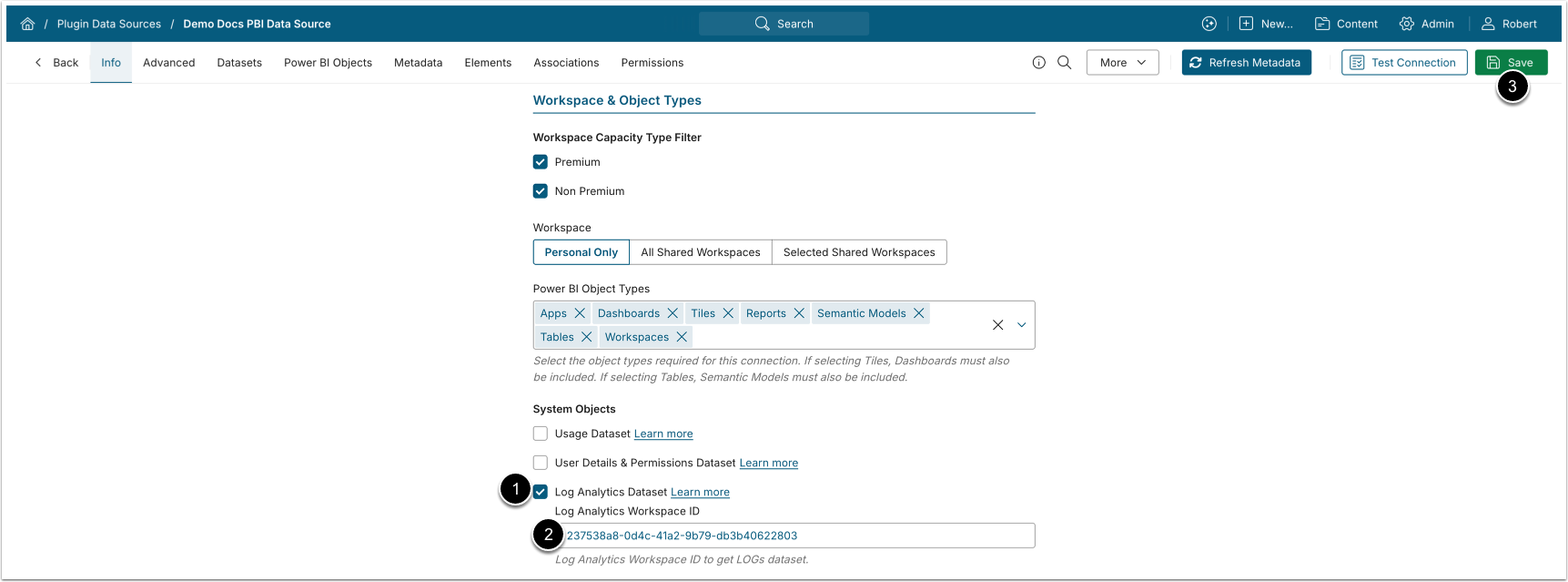 Before proceeding, ensure that all prerequisites are met and that initial configuration has been completed based on your selected authentication type. Then, enable Log Analytics integration in both Azure and the Power BI Admin Portal, and configure the required Azure App. Once setup in Azure is complete, return to Metric Insights to enable metadata collection and configure the Power BI Cloud Data Source.