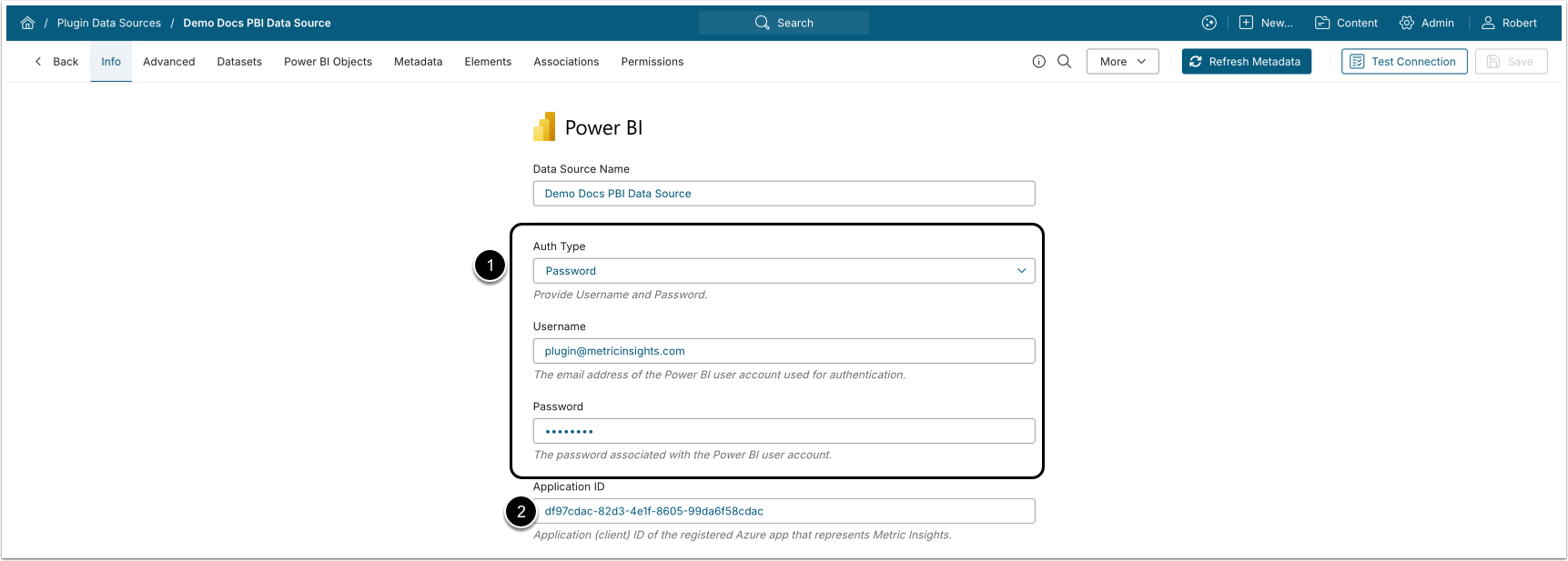 - Enter Application ID of the registered Azure app that represents Metric Insights to connect to Power BI.