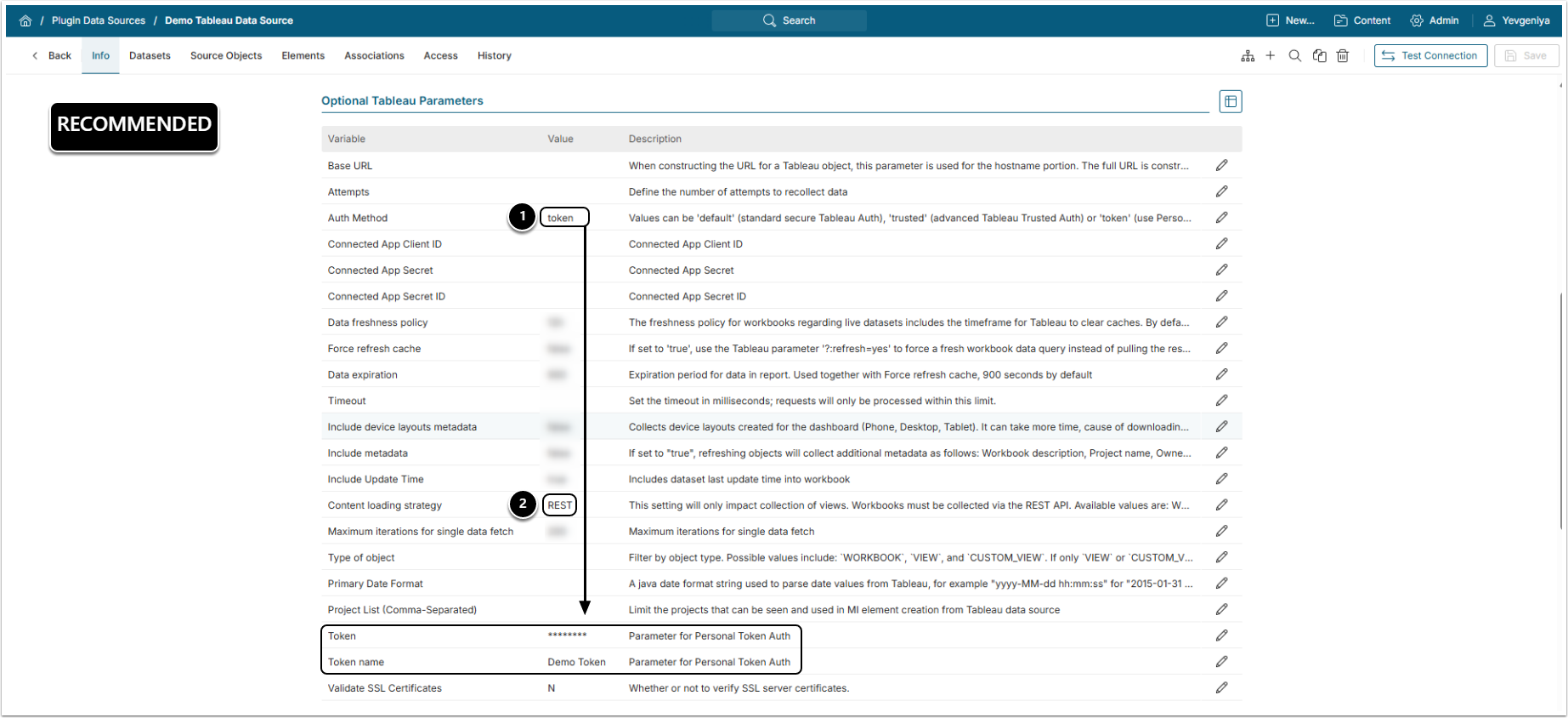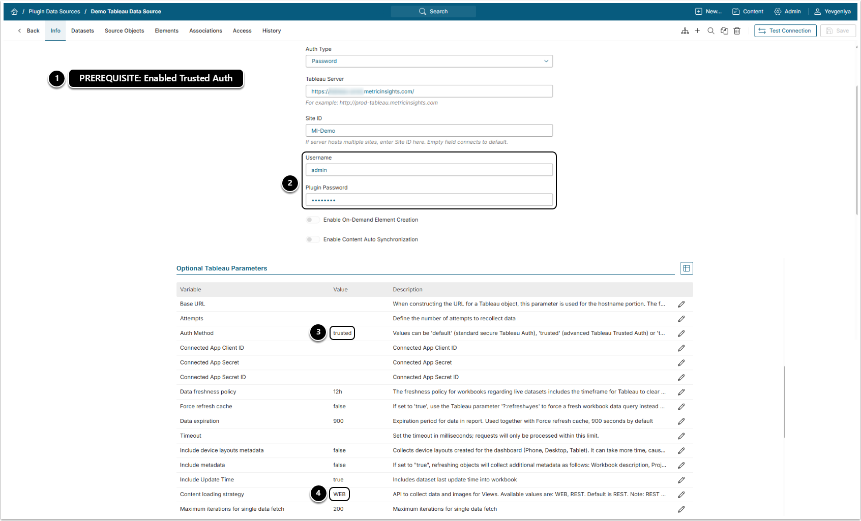 In the Plugin Connection Profile, the selected Auth Method determines the authentication mechanism used to connect to Tableau. It is configured via Auth Method Optional Parameters. There are three main Auth Methods for Tableau Plugin: